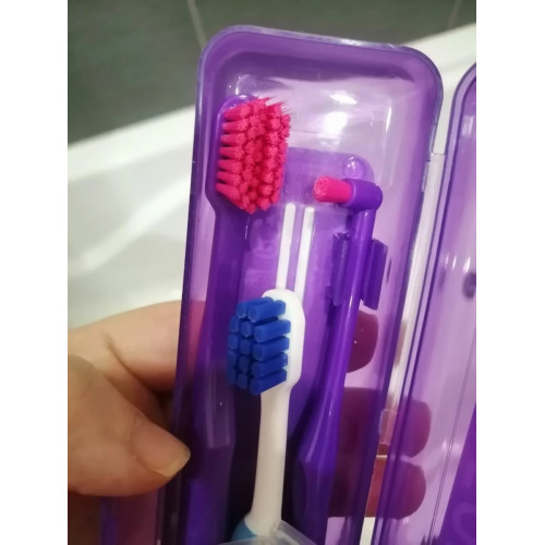 Отличный набор для тех, кто носит брекеты, особенно если надо взять с собой в дорогу все, что надо. Отличная мягкая щетка для прочистки брекетов, монопучок, чтоб прочищать труднодоступные места и между плотными контактами зубов, ершики,чтоб дочистить все замочки и крепления. Без проблем дополнительно вмещается обычная щетка, она тоже необходима для гигиены. Также используем ревилайн детскую, так как ей удобнее чистить зубы. Защитные колпачки не используем, чтоб щетки просыхали и не копились бактерии.