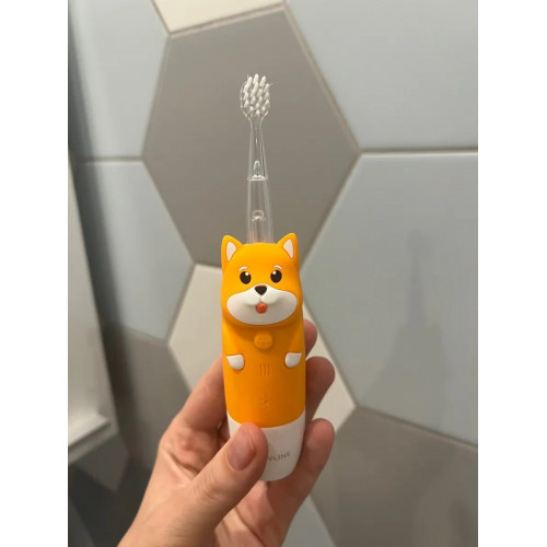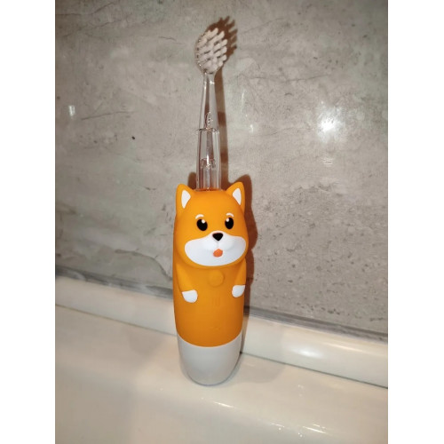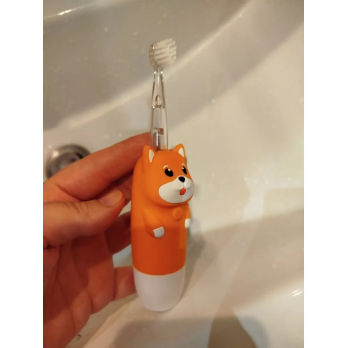 Щетка выглядит симпатично, удобно лежит в руке. Однако цвет отличается от фото на коробке, вживую оранжевый светлее. При первом нажатии включается подсветка, при повторном добавляется жужжание на трёх разных скоростях. Ребёнку год, не испугался, но пока чистить не согласился. Но тут нужно время привыкнуть, рассмотреть хорошенько) Будем надеяться, что щётка поможет решить проблему бунта при чистке зубов…